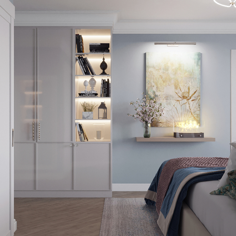 Заказчики очень хотели большой встроенный камин. Для этой цели в спальне могло подойти только место в ногах кровати, но из-за недостаточной ширины комнаты, нам пришлось было вообще отказаться от этой затеи. Но в итоге нам повезло найти вот такую крошку - миниатюрный биокамин, который помещается на обычной полке. :)
