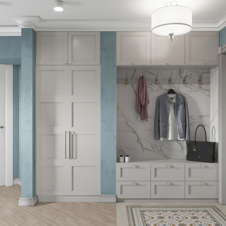Для стен прихожей взяли серо-голубой оттенок, на его фоне которого эффектно смотрятся плинтусы и белая мебель. У входной двери на полу «ковёр» из яркой плитки. Ниша возле встроенного шкафа оформлена плиткой «под мрамор» из керамогранита (такую же использовали на кухне). В общем, малютка-прихожая получилась и практичной, и очень нарядной!
