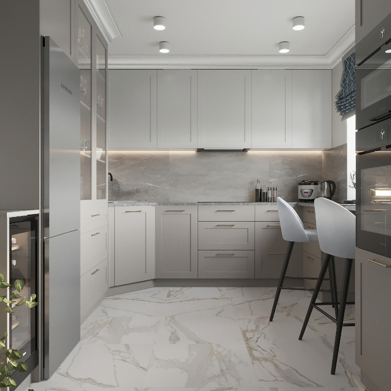 С учётом того, что в гостиной есть большой раздвижной стол, за которым можно собираться всей семьёй, в кухне можно было обойтись без обеденного стола. Метраж здесь всего 9,6 м, поэтому важно было урвать каждый свободный сантиметр. Решение с П-образной столешницей по периметру кухни - настоящий лайфхак для маленьких квартир!