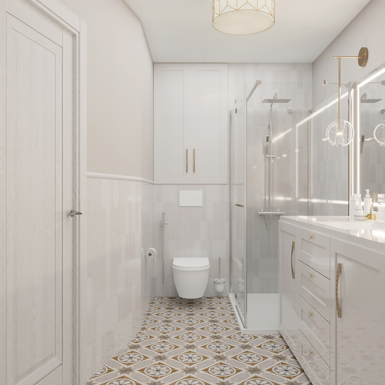 Изначально в квартире была отдельная ванная комната и маленький туалет. Из первого санузла мы сделали совмещённый, а второй оставили каким он был. В большом санузле поставили душевую кабину, освободив таким образом место для подвесной конструкции унитаза.