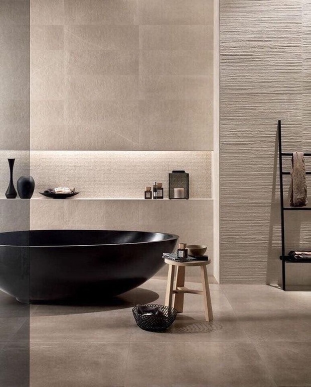 Можно выделить стену за ванной геометрическим рисунком, сделать на ней акцент или более «активной» плиткой, а остальные стены и пол сделать спокойнее. А темными элементами, скажем полочки, рама зеркала, аксессуарами для ванной поддержать этот акцент.
