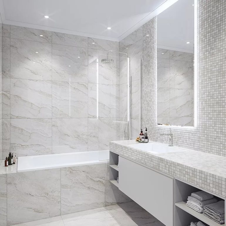 Плитку нейтральную в Леруа мерлен или в Мосплитка.ру можно найти под любой бюджет. Тумба и зеркало из Икеа. В Икеа кстати вообще много неплохих вариантов для бюджетной комплектации ванны, прям советую съездить и посмотреть.