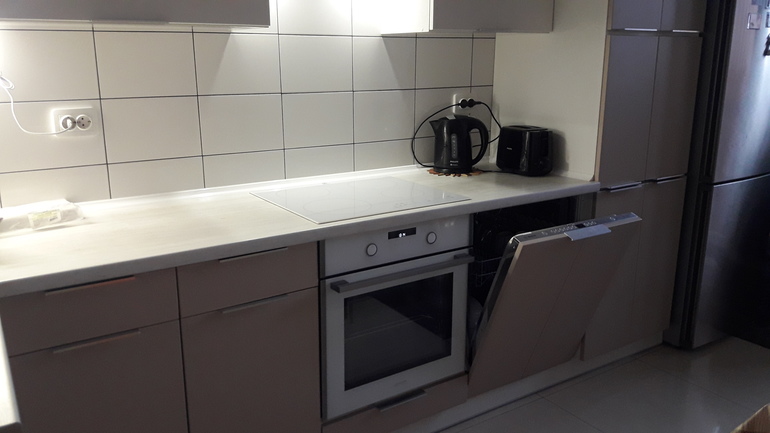 Ирина, Вот и я хотела такое предложить. Почему-то все ищут сложные пути в коментах. Тут идеальное место справа от плиты. Минимум переделок. Даже фасад нужный. Только дно нужно будет убрать и все лишнии внутренности, т.к. посудомойка на пол ставится. Немного наростить слива жеской трубой, воду тоже наростить. Шланги длинные у ПММ (по крайней мере у нашей Electrolux), но их всё таки не хватит. Мне кажется наростить слив проще, чем так с фасадами заморачиваться, подойдут ли в тон новые - вопрос. Партии разные и по тону могут отличаться. А еще и столешницу менять.... Это столько деньжишь уйдет. Я б и ПММ не захотела после такого ценника, тем более в новой кухне. У меня косяк с трубой был, её, как розетку для ПММ (писала в ответ на комент тут выше) вывела за ПММ, не знала, что она почти вплотную к стене встает. Так мой сантехник переделал мне за 15 мин, дольше паяльник грелся для этих труб.