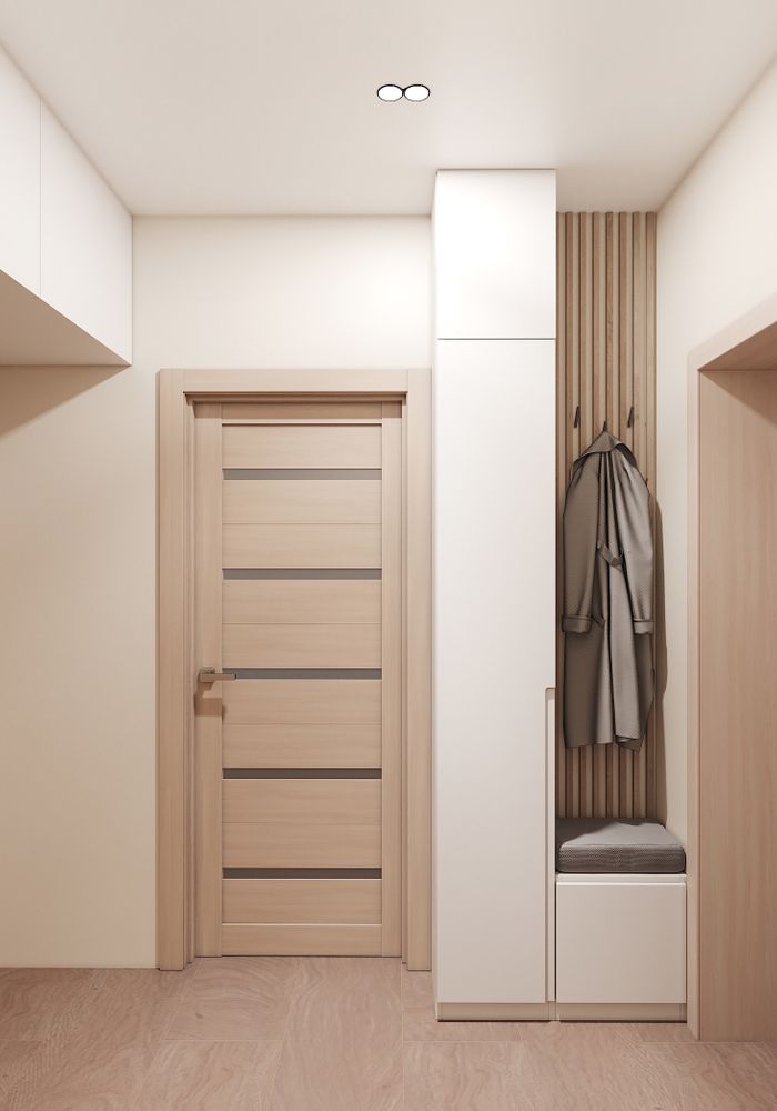 Как бы мало места не было, всегда можно продумать функциональную и красивую планировку. Например у входа в квартиру расположить небольшой шкафчик, где можно хранить верхнюю одежду по сезону и мягкое сиденье.