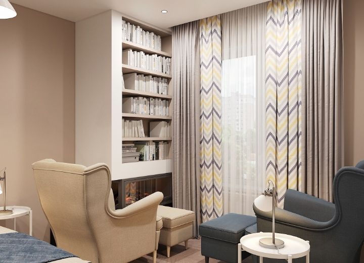 В спальне же хотелось выделить зону для отдыха, например, удобное кресло перед камином, где можно почитать книгу или просто провести приятно время с близким человеком за разговором с чашечкой кофе.