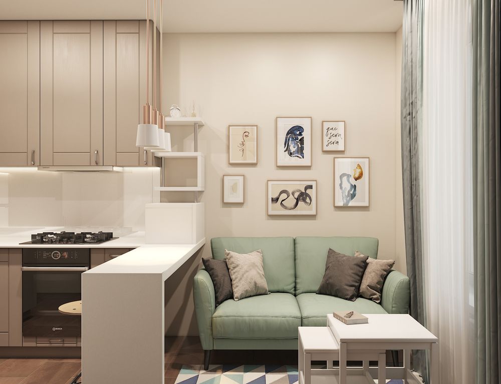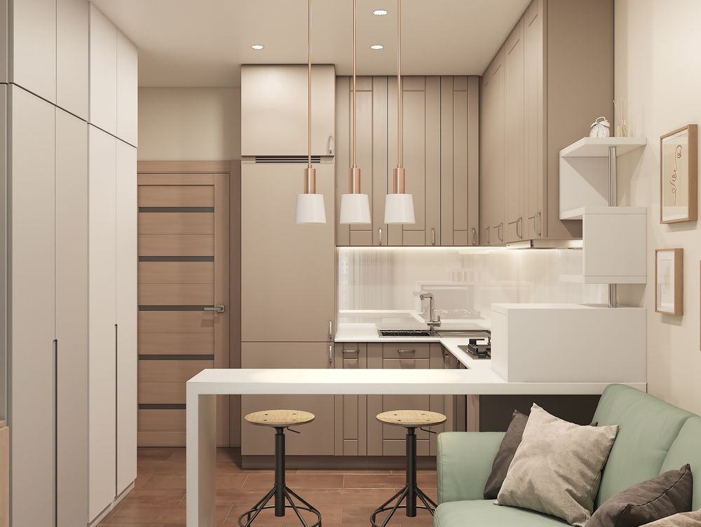 Было решено сделать зонирование на кухню-гостиную, при этом самое главное выделить достаточное количество места для хранения каких либо вещей.