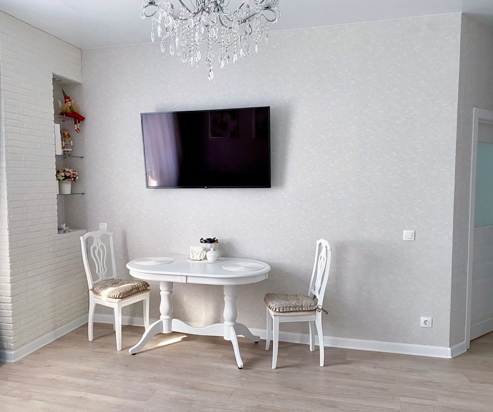 Вероника, у нас на кухне телевизор весит точно в углу, с помощью кронштейна с поворотными петлями (как длинная «лапа», складывающаяся пополам) очень удобно. В вашем случае можно развернуть к смотрящим а затем вернуть в декоративно-идеальное расположение.