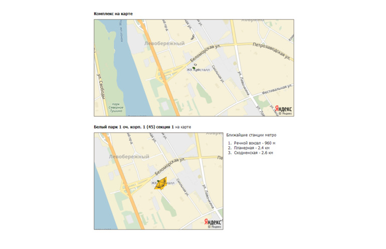 Комплекс имеет крайне удачное расположение. Он находится в экологически благоприятном районе, недалеко от Химкинского водохранилища, Канала имени Москвы, парка «Дружба». Подобное соседство дает возможность жителям отдыхать на природе не выезжая за пределы города. Транспортная доступность ЖК обеспечивается близостью к метро «Речной Вокзал» и обширной сетью наземного общественного транспорта. Автомобилисты имеют возможность воспользоваться Ленинградским шоссе. Также есть удобный выезд на МКАД через улицу Дыбенко и возможность попасть на Дмитровское шоссе.Покупатели могут выбрать квартиру, полностью удовлетворяющую их потребностям: от одной до четырех комнат. Площадь жилых помещений варьируется от 39 до 124,99 кв. м. Высота потолков составляет свыше трех метров, почти все квартиры имеют балкон или лоджию. Кроме того, будущие жители имеют возможность реализовать свои дизайнерские фантазии, которые не будут ограничивать несущие стены - квартиры в ЖК имеют свободную планировку.