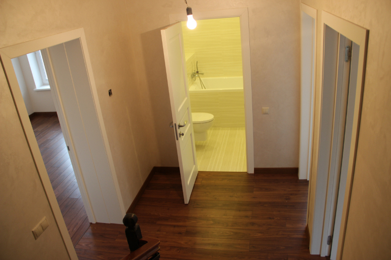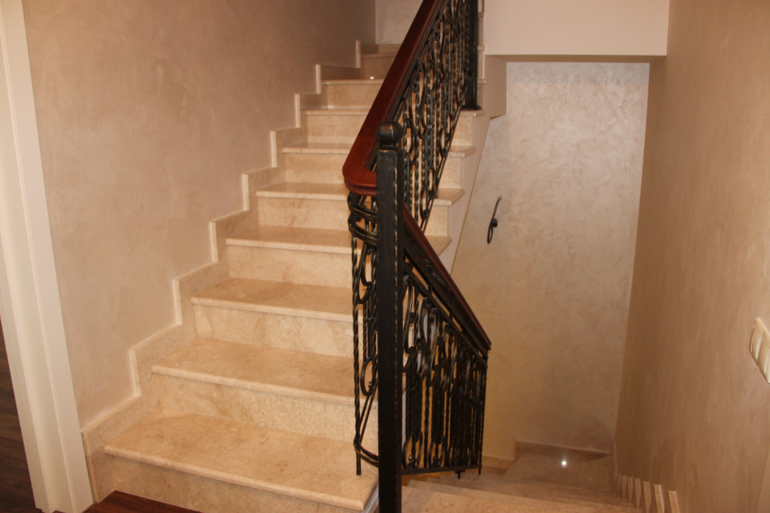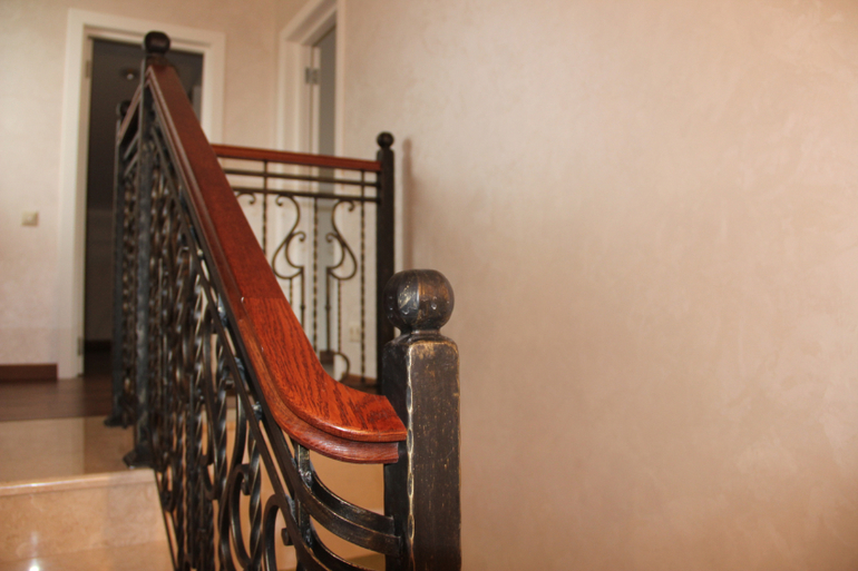 Стены - обои, декоративная штукатурка - под шёлк, лестничный марш - дуб с элементами ковки, мебель и двери - Италия