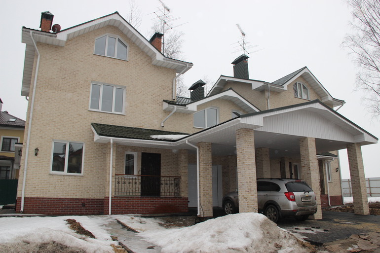 Стены-кирпич, снаружи облицовка декоративной плиткой под кирпич, между ними утеплитель (термопанели-Австрия). Перекрытия-железобетонные плиты.