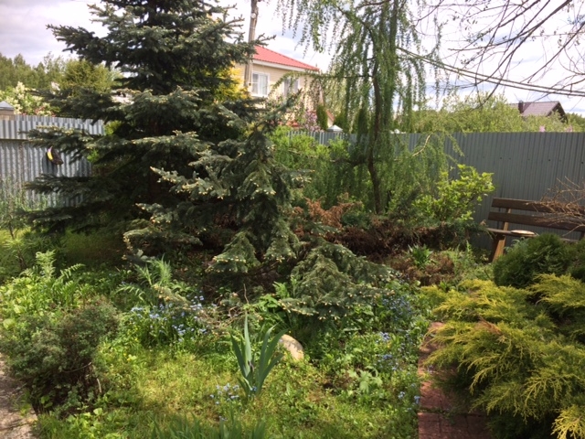 Участок очень зеленый и ухоженный, при входе на территорию голубые ели, туи и разные другие кустарники, есть даже крошечный прудик.