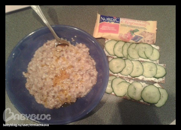 3 хлебца с творожным сыром и огурчиком, и галета овсяная)) нам-ням))