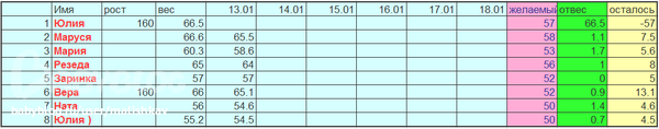 Девушки, привет. Юлия одобрила предложение создать таблицу. Завтра утром будет пост в отчетах результатах. создам таблицу по данным 10го числа ( как начало похудения) и в дальнейшем буду заполнять ее регулярно. У кого то есть предожение как назвать наши посты, чтоб мы не теряли друг друга?