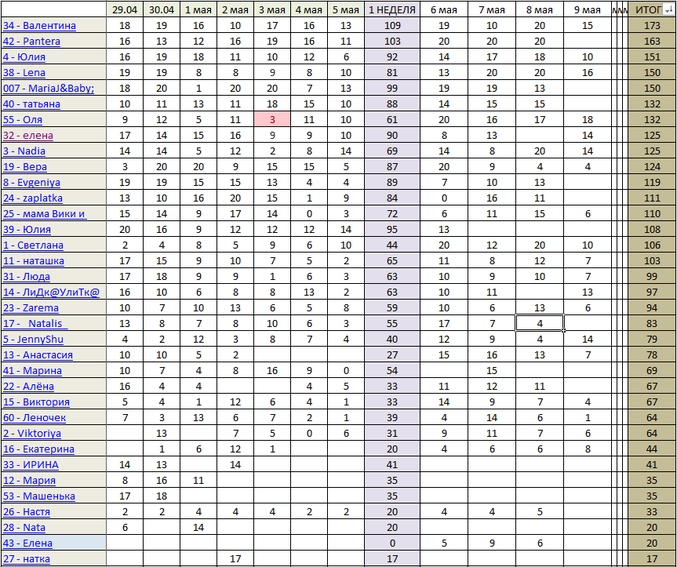 #32 приветик, пп 9баллов, спорт 3 балла( целый день гуляли, вечеро 30 дневка сджилл) джокер 4 балла, уход 1 балл(были в бане у друзей, мазюкалась глиной) итого 17 баллов