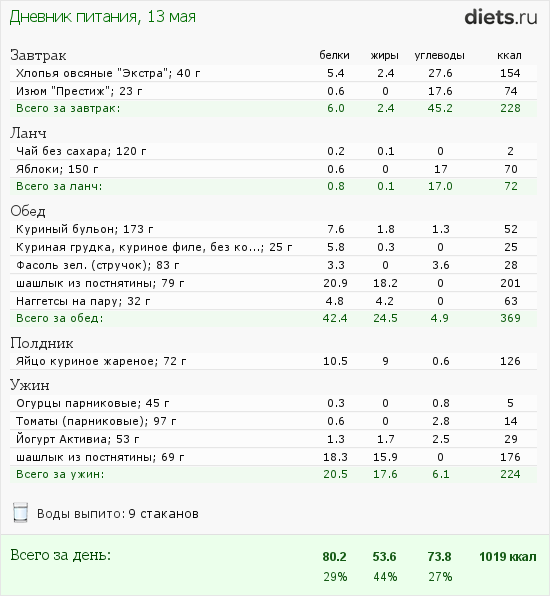 По меню: на обед доела сынулин ужин (наггетсы на пару) - поэтому такие смешные граммы )) и 4 маленьких кусочка шашлыка... Вообще не смотря на шашлык по калоражу получилось довольно мало... ну +/- погрешности - нормлаьно... вот сколько не ешь, а жиров все время дохера выходит ((( отключу процентное соотношение, а то вечно расстраиваюсь ((