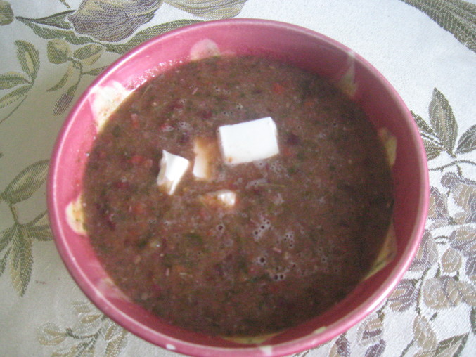 обед:суп-пюре из красной фасоли, шпината, сельдерея + кусочек брынзы (см фото)