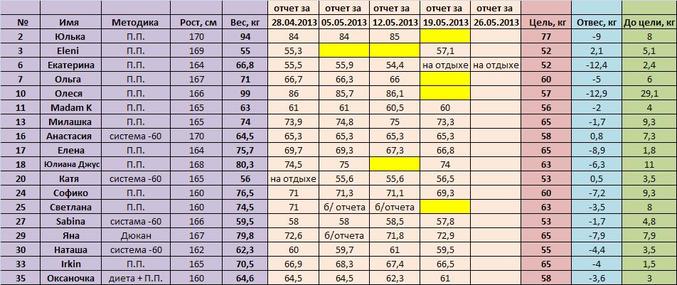Приветики!!! Не надо мне желтую карточку, я с вами до победного!!)) Были на даче, вчера писала с телефона, что вес стоит, не косячу, что 84.300 мне припиши, №2. А коммент, гадина, не отправился!(((((( А,а,а,... можно мне иногда чуть с опазданием отчитываться??? максимум, на 2 дня, а то мы по понедельникам-вторникам возвращаемся. А с 1 июня я на месяц на дачу еду, буду очень стараться писать с телефона, но сеть там ловит совсем хреново((((((( НО я ЖЕЛЕЗНО остаюсь в табличке, не сольюсь.