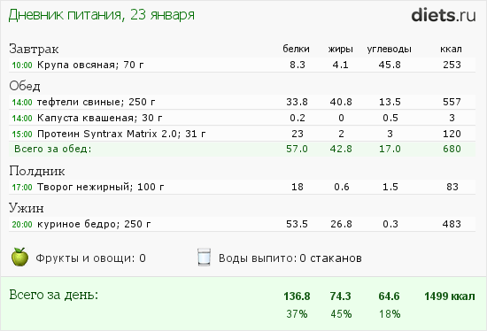 Марина,подскажи ,вот если я не съем мясо в обед или на ужин ,или мясо в обед съем а кашу нет ,то получается день ПП в пустую прошел .Меня тренер ругает ,говорит что если написано в обед крупа или макароны + мясо ,значит так и кушать ,а мне иногда в обед хочется мясо и овощи .При том что овощи можно соленые и квашеную капусту и т.д Я на диетс.ру веду дневник питания ,там я подсчитываю что за день съела , то бывает что жиров больше чем углеводов , по белкам я набираю 120 гр бывает и больше .А вес стоит ,мышцы есть ,чувствую по жирком ,но их не видно ,если только еле еле