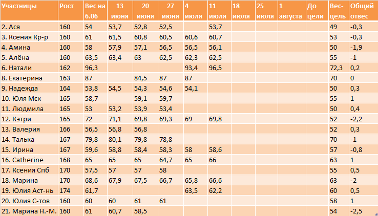 17 Ксения. у меня 2 недели пролетели я даже и не заметила,и только сегодня вспомнила ,что надо бы отчитаться(( у меня все так же стабильно 58 кг. Упражнения забросила, зато только салатики, овощи,травы ,грудка,рыба и греча на пару,да здравствует лето)))