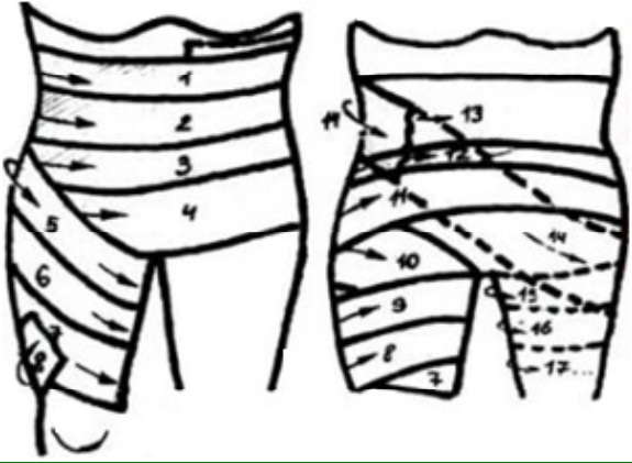5) Проводят обертывание на левом бедре по той же схеме (14-17).