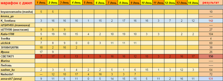 табличку с результатами я добавлю когда все напишут результаты за пропущенный мной день