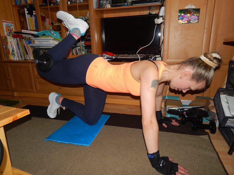 7.Упр."Собачка" с отставлением ноги назад.Вес гантели на ноге 6кг.Через день меняю на отставление ноги в бок.40 повторений для каждой ноги