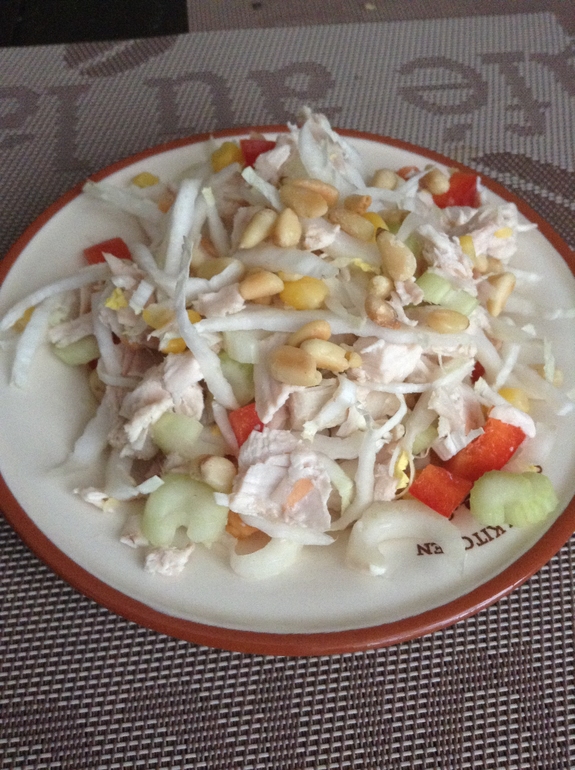 Дальше любые ингредиенты из этих: помидоры, перец сладкий, сельдерей, кукуруза, горошек, огурец, авокадо, кедровые орешки (буквально щепотка)