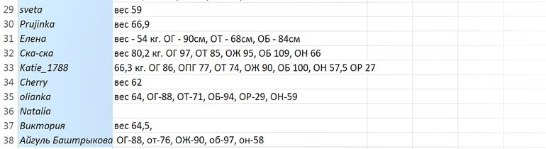 Да-да, нас целых 38 человек)) Надеюсь до конца дойдем почти все)) Если вдруг кто себя не нашел, увидел ошибку или что-то еще, пишите мне. Табличку делала вчера ночью, так что кто не прислал мне свои параметры виноваты сами, теперь впишу их через неделю, извиняйте)