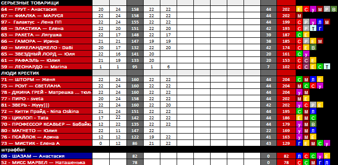 Всем добрый вечер! 84- Мелинда Мэй. Пп-12, спорт-0 (не успела(((), джокер -4, уход-1. Итого-17.