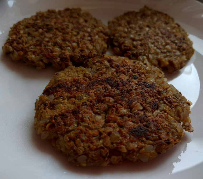 Обед: Вкуснотенские котлетки на сухой сковороде. Решила зачем заморачиваться с котлетами и гарниром - пусть будет общие (чечевично гречневые) + айсберг