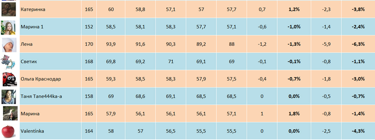 Итак в этой таблице видно кто и сколько скидывал веса за месяц.