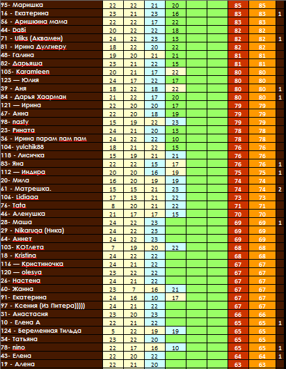 №123ПП - 12Спорт - 5 (пробежка, велосипед, пресс-8 минут)Джокер - 4Бонус - 2Уход - 1 (ацкрем)ИТОГО: 24 балла
