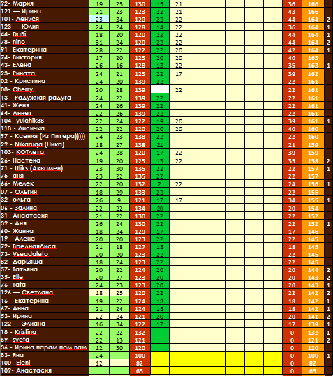 64: ПП -12, спорт - 5 (ДМ йога), уход - 1 (попакрем и массаж), джокер - 3 (досчитала только до 3, может и чуть больше но пару раз сбивалась). Итого: 21.