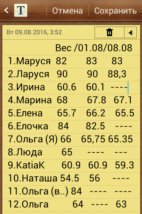Оля, последняя это я что ли? Мой номер 12? В посте стоит 09.07.2016 г. Только нашла вчерашний пост. 09.08. вес Вес 63, 5 привес 500 гр.