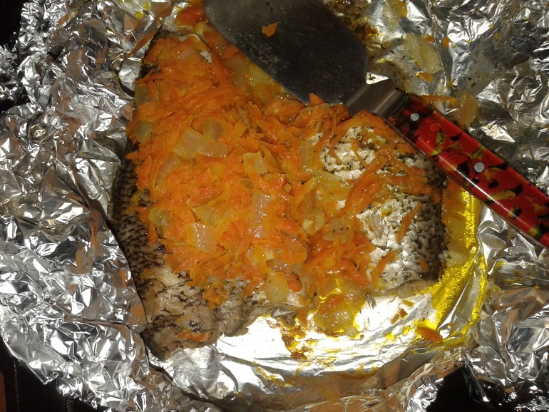 Ну и рыбка. Рецепт : потушила морковь с луком и солью (очень мало) и в противень положила фольгу. Рыбу (она уже была очищена и выпотрошена, и без головы) обмазала специями для рыбы, не густо )) Масла не использовала совсем. Рыба дала сок и он смешался с морковным соком, так как морковь я чуточку недотушила, добавляя кипяток. Такая получилась вкусняшка. За счет отсутствия сыра можно считать идеальным блюдом для пп .