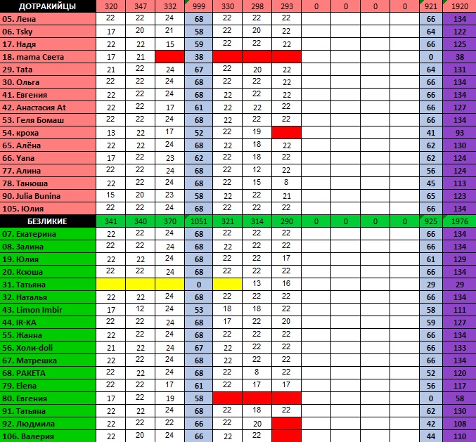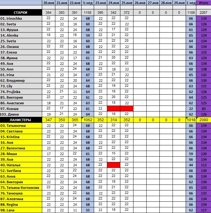 Дотракийцы №42 пп - 12 спорт - 5 (упры на тренажерах + беговая) джокер - 4 (1,2,5,6,9,10,11,14,15,23,24,28) уход - 1 (баня+скраб) Итого: 22