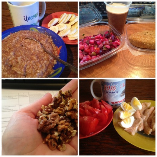 завтрак - овсянка на воде с добавлением какао, масла сливочного и меда, банан, чай