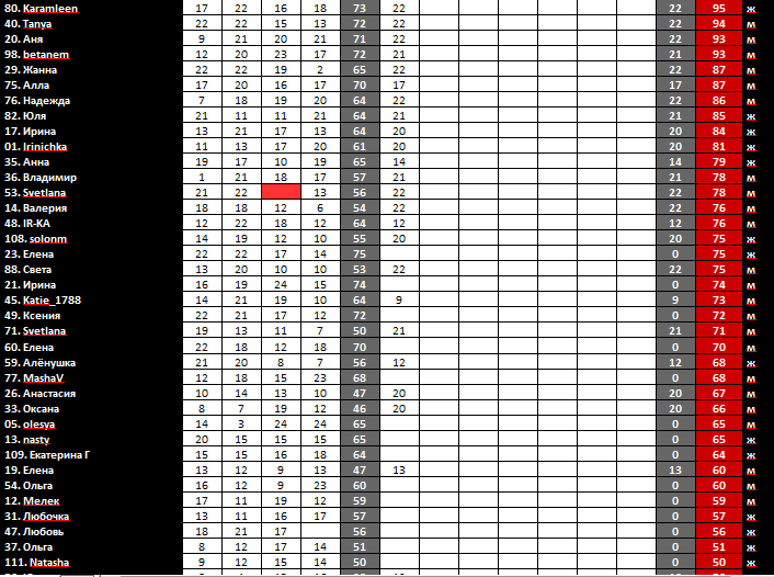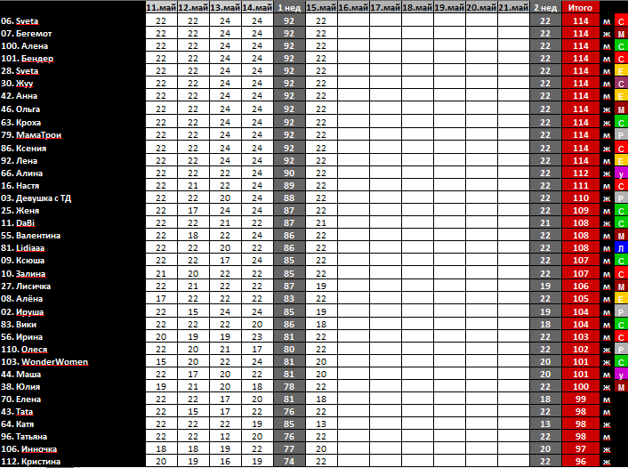 № 109Нет сладкому - 5, 5/6 приемов пищи - 1, распределение -1, вода - 1, фильтр - 2 приготовление - 1Спорт - 5 (упражнения на пресс, ноги)Джокер - 4Уход - 1 (кремчик)ИТОГО: 21