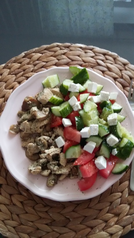 Мой обед: индейка с грибами и овощной салат с брынзой😛
