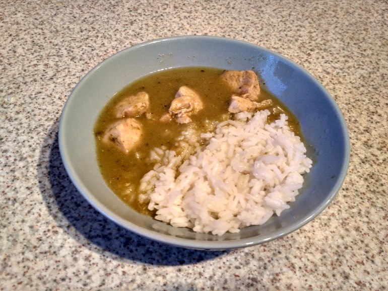 Итак на 4 порции готовила: 450 гр куриной грудки, банка кокосового молока, 4 ложки зеленой карри пасты. Всё!