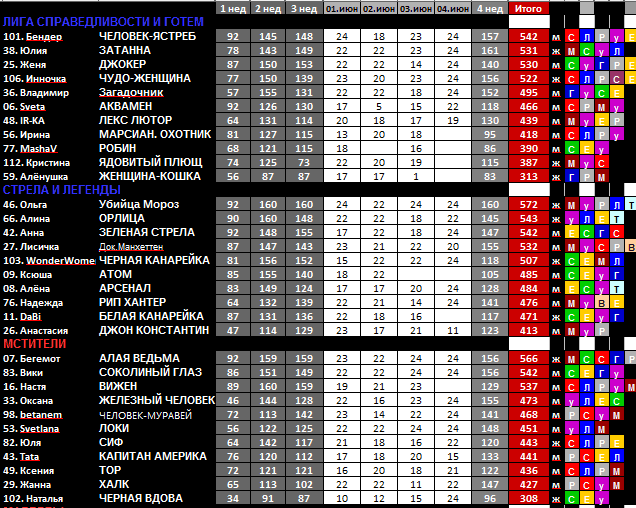 за ВОКРЕСНЫЙ ДНЕВНОЙ РЕЗУЛЬТАТ ПО 2 БАЛЛА ВСЕМ ЧЛЕНАМ КОМАНДЫ - МСТИТЕЛИ (22,5), ЛЮДИ КРЕСТИК (21,7), Щ.И.Т. И КОМПАНИЯ (21,2)![]()