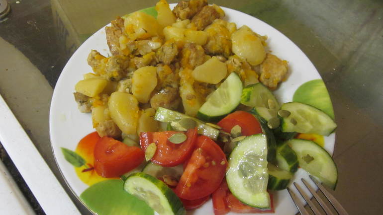 Обед(13-00): тушеный картофель с говядиной, салат(огурец, помидор, раст.масло и тыквенные семечки). Половинка рисового хлебца