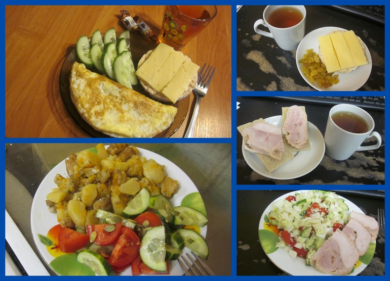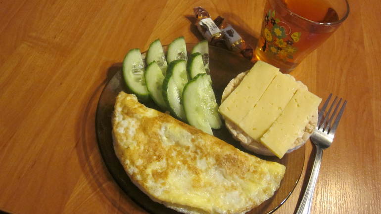 завтрак(7-30): два яйца жареных без масла, огурчик, чай б/с + рисовый хлебец с сыром и две конфетульки.