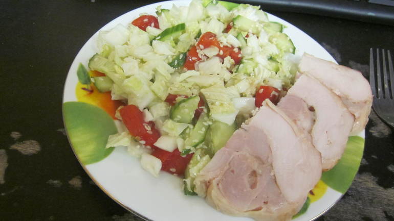 Ужин(18-00): буженина(два кусочка съела = 65гр) + салат(огурец, кит.капуста, помидор + капля раст.масла и кунжутные семена)