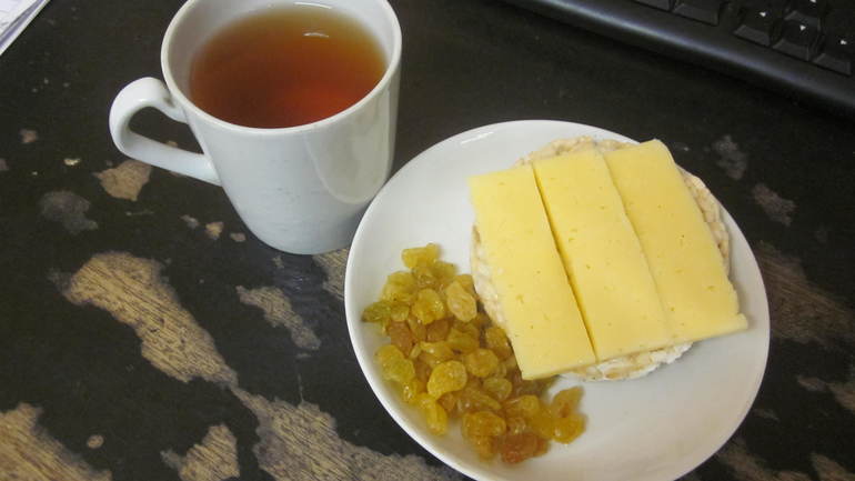 Перекус(10-00): чай б/с + рисовый хлебец с сыром и немного изюма