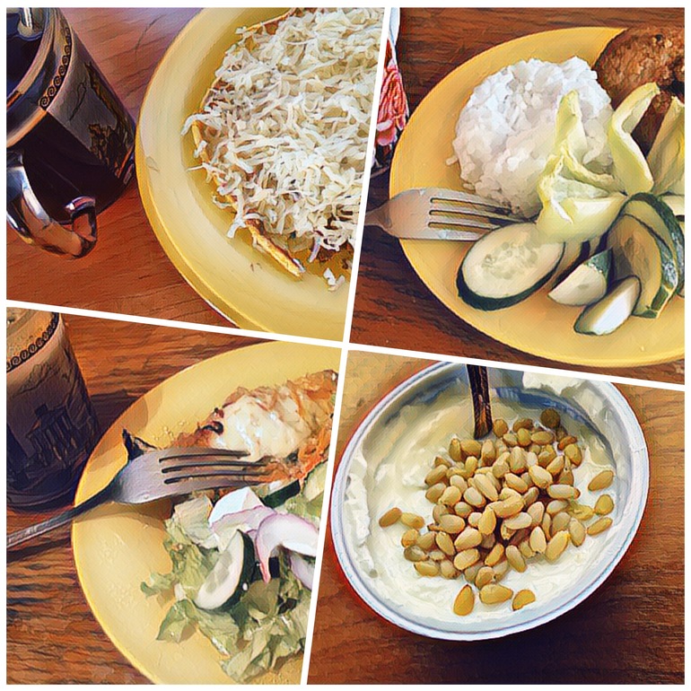 Ужин - доела наконец-то рыбу под морковной шубой, салат (листовой салат, огурец, красный лук, брынза, подсолнечное масло), кофе