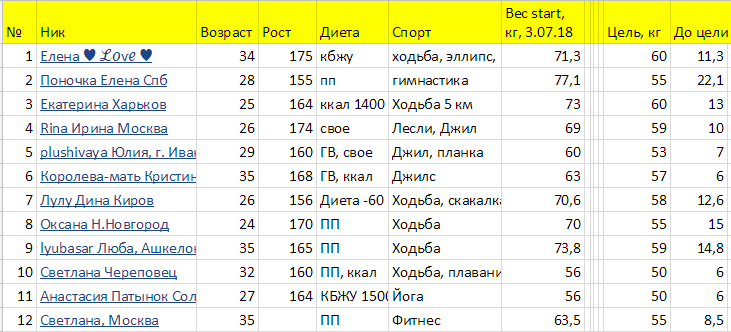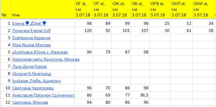 Создала таблицу в ГУГЛ, заходите сюда, проверяем данные, если что исправляем (свободный доступ). Если не хотите, чтобы все имели доступ к таблице, то скидываем мне эмейл гугл, сделаем закрытую таблицу для свей группы (но тогда всем надо будет дать эмейл гугла, можно в лс). Мне будет так удобнее, вы будете свои параметры 1 раз в неделю вносить сами, чтобы я не теряла время на ввод))) Я буду сводить и выкладывать скрины наших успехов 1 раз в неделю.