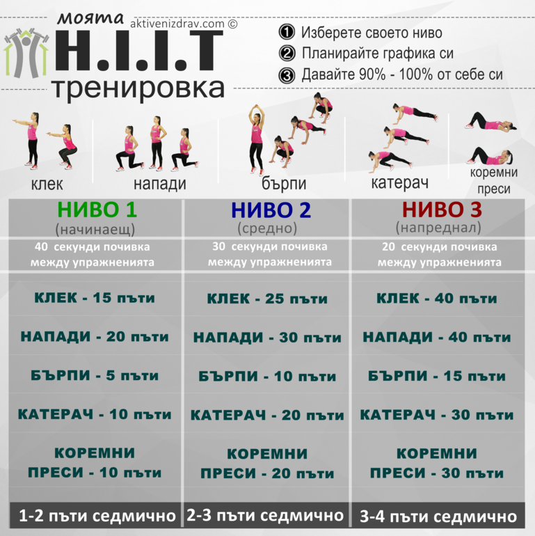 HIIT - это «high-intensity interval training», то есть интервальная тренировка высокой интенсивности. Обычно это 4-5 упражнений на разные группы мышц, которые выполняются в 3-4 подхода без пауз для отдыха. И все бы ничего, только упражнения сложные и изматывающие.