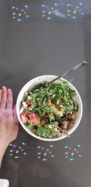 Вот такая порция салата( фасоль, творог, красная фасоль, помидор, руккола, отруби, зерн.горчица)😋