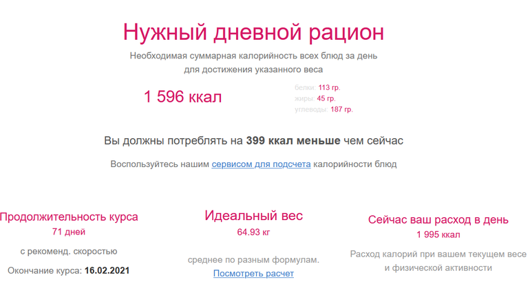 Пример, у меня рост 175, вес 63,7 кг, физ нагрузки 1-5 р. в неделю. С помощью этого сервиса вы можете рассчитать норму калорий для себя для похудения и поддержки веса. http://diet.neolove.ru/calc/calc_global_pohudenie/